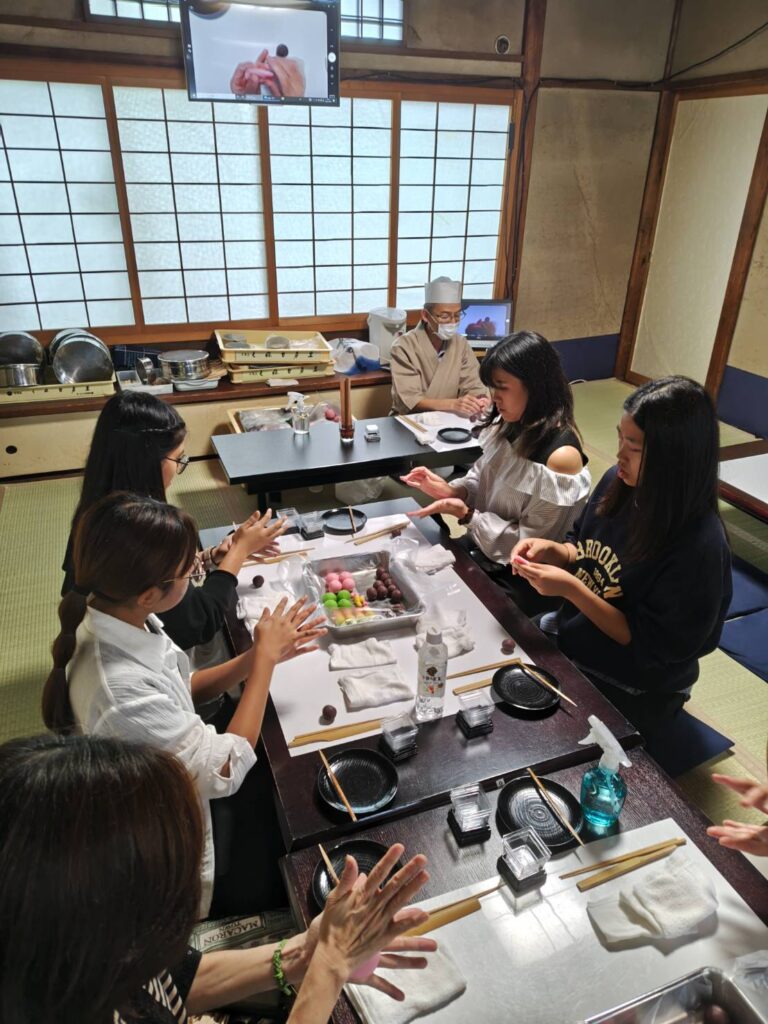 智積院から徒歩で5分ほどの「甘春堂」に移動し、和菓子作りを体験しました。そのうちの1つを薄茶と共に頂いて、お茶の立て方、茶道のマナーなどをお教えしました。