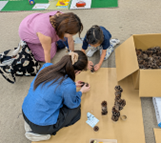「触る」は、全ての活動に通じる感覚ですが、特に子どもたちに人気の繭玉転がしは、本物の繭の感触や起き上がりこぼしのような動きの面白さがたまらなく、何度でも転がしてみたくなる「はまる」遊びでした。また、屋外で拾って来た、ただの「まつぼっくり」も遊び道具になると、どうやって高く積めるか試行錯誤しながら、ついつい熱中する奥深さを秘めており、積みあがったときの美しさも自然ならではの素材だからこそと思いました。
