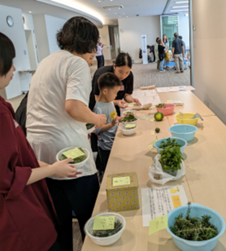 「匂う」では「においコンテスト」を行いました。過去に一度、匂いをテーマにして人工物やスパイスなど様々なにおいを体験する回があったのですが、今回は7種類の葉っぱの匂いを比べて一番好きな匂いを選んでもらいました。一番人気は、夏ミカンの葉っぱで、こすると夏ミカンの実のようないい香りがしました。近郊の川原で摘んできたアップルミントに青虫のおまけつきで、子どもたちも喜んでみていました。