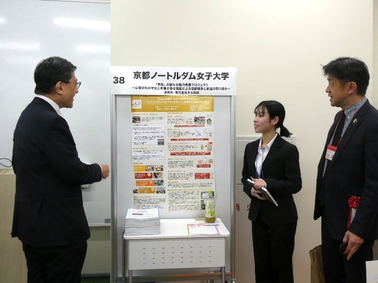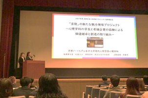 この事業には、京都府内の大学より55プロジェクトが参画していますが、心理学科「京麸の新たな魅力発信プロジェクト―心理学科の学生と老舗企業の協働による価値継承と創造の取り組み―」は6つの壇上報告チームの一つとして選定されました。