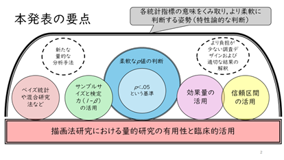 Cohenが1994年に発表した「The Earth Is Round (p < .05)」(Cohen, 1994)に端を発し,再現性の低さや偽陽性の高さなど、心理学分野においてよく用いられる帰無仮説検定への疑問や批判が従来以上に行われるようになりました。私はこの論文の中でCohenがタイトルだけでなく、帰無仮説検定のことを「statistical hypothesis inference test」と略称にすると大変なことになる皮肉的な呼称を提案したり、「mechanical dichotomous decisions around a sacred .05 criterion(神聖な5%基準による機械的二分法)」などとさらりと書いているところに刺激を受けて、あらためて描画法研究においても統計手法を臨床に活かすためにはどのようにしたら良いかを考え発表をいたしました。