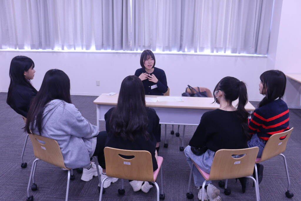 「キャリア教育」と聞くと、社会人から話を聞くだけという固い印象がありますが、このイベントでは、「女子大の雰囲気はどうですか?」「どんな勉強していますか?」「お給料はいくらですか?」など、高校生が聞きたいことを尋ね、明るい雰囲気のなか笑い声も聞こえてきます。