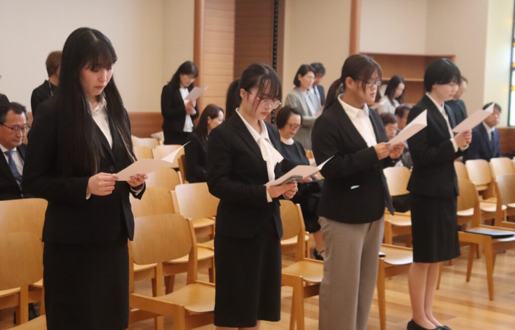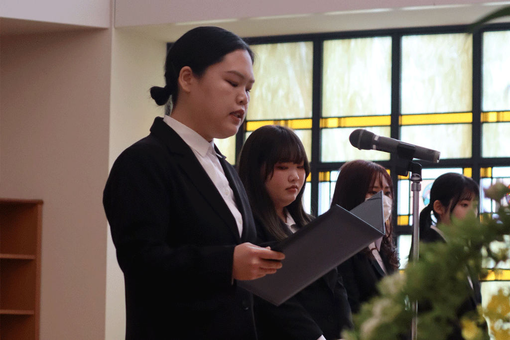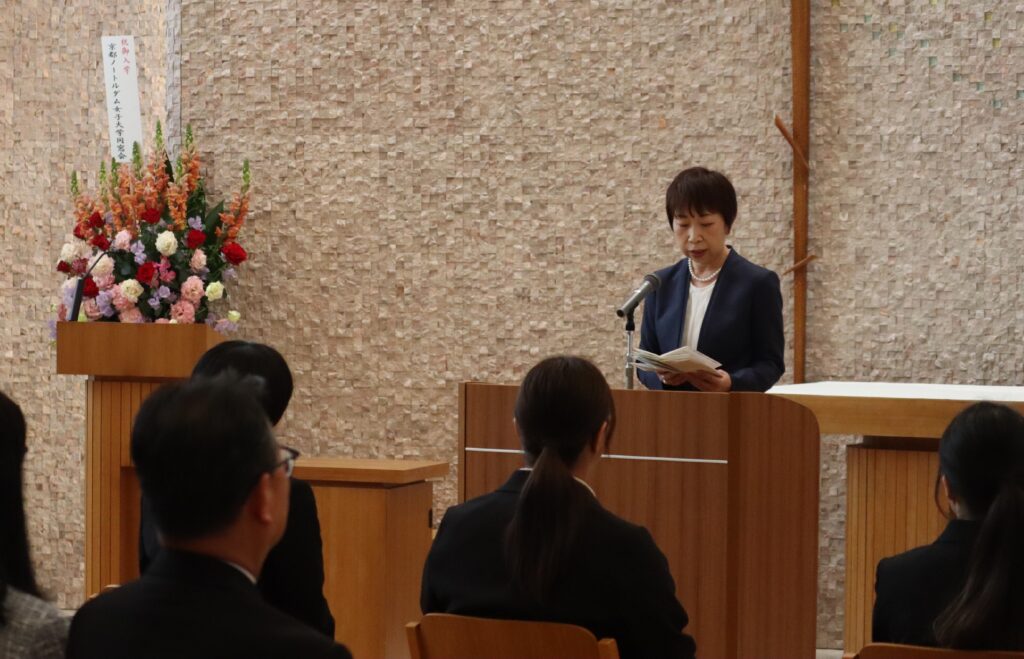 新入生代表が誓いの言葉として、「新たな大学院生活への期待とともに、不安もありますが、これまでの学びを糧に、研究活動を通して人としても成長できるよう努力してまいります。また、『ミッション・コミットメント』のもと、『徳と知』を兼ね備えた女性となれるよう日々精進することを誓います。」と力強く述べました。
